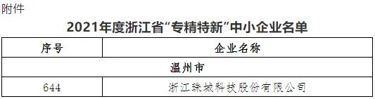 近日,浙江省經(jīng)濟和信息化廳發(fā)布了《浙江省經(jīng)濟和信息化廳關(guān)于公布2021年度浙江省“專精特新”中小企業(yè)名單的通知》,浙江珠城科技有限公司成功通過遴選,被認(rèn)定為2021年度浙江省“專精特新”中小企業(yè)。
